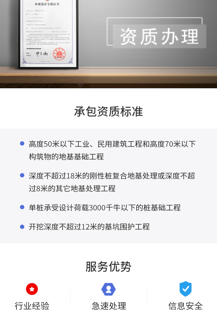 以上關(guān)于”地基基礎(chǔ)工程專業(yè)承包資質(zhì)標(biāo)準(zhǔn)(三級)“資料僅供參考,若想詳細(xì)更多信息,歡迎來電咨詢:400-600-2247(免市話費(fèi)),每天前10名咨詢的客戶可享受公司注冊免費(fèi)核名服務(wù)!