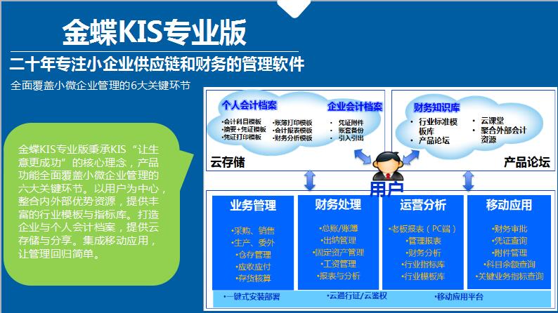 金蝶KIS專業(yè)系列以“讓小微企業(yè)管理更簡(jiǎn)潔、更專業(yè)”為核心理念,軟件功能全面覆蓋小微型企業(yè)管理的六大關(guān)鍵環(huán)節(jié):采購(gòu)管理、銷售管理、生產(chǎn)管理、委外管理、倉(cāng)存管理、財(cái)務(wù)管理,以豐富的的報(bào)表為企業(yè)管理者提供實(shí)時(shí)查詢和決策依據(jù);在財(cái)務(wù)、業(yè)務(wù)一體管理的同時(shí),整合了移動(dòng)互聯(lián)網(wǎng)、社區(qū)網(wǎng)絡(luò)和云計(jì)算技術(shù),為企業(yè)的用戶提供更加個(gè)性化的使用體驗(yàn)。